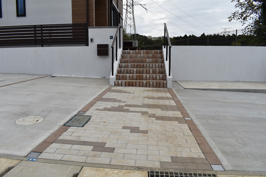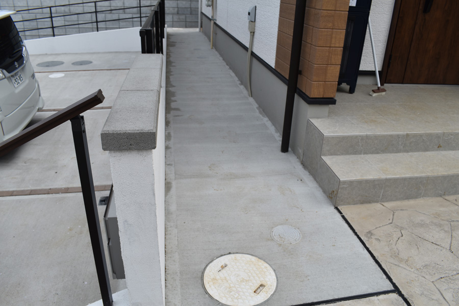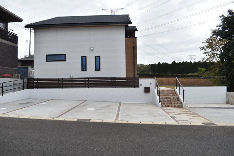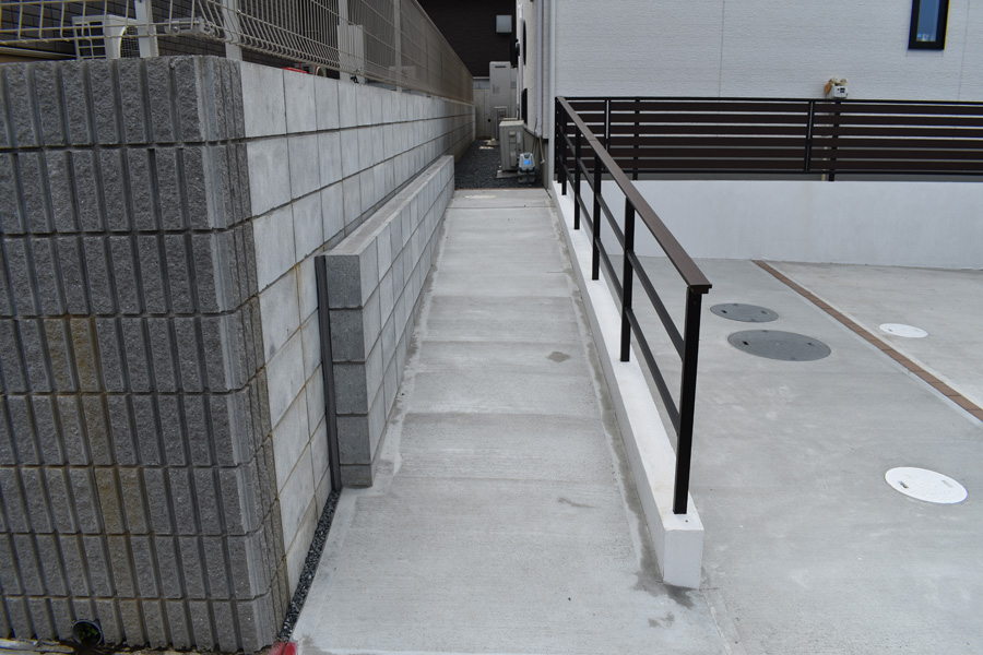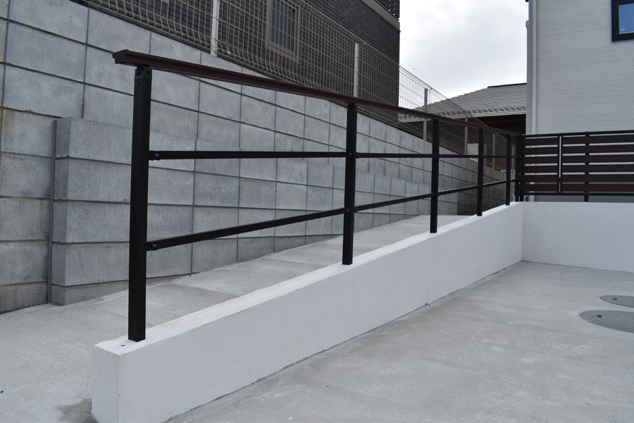 広い駐車場では車の出入りもスムーズで、玄関アプローチやスロープに手すりを付けて上り下りがしやすい構造となっています。 また、目隠しフェンスが設置されているので、お部屋の中やお庭での作業なども人目を気にすることなくプライベートな空間も確保できますね♪