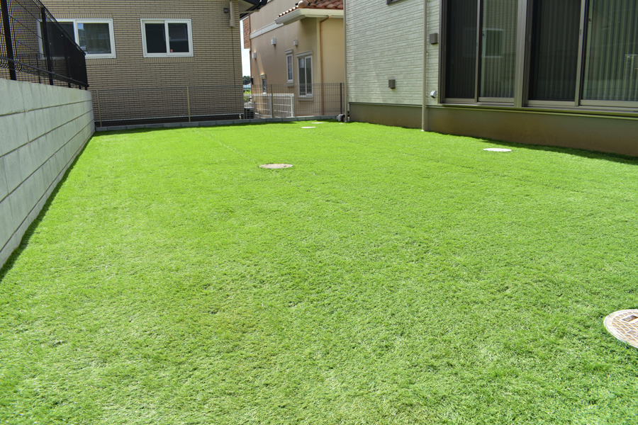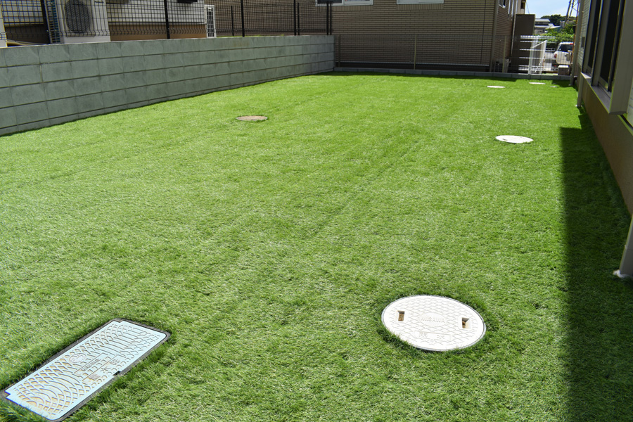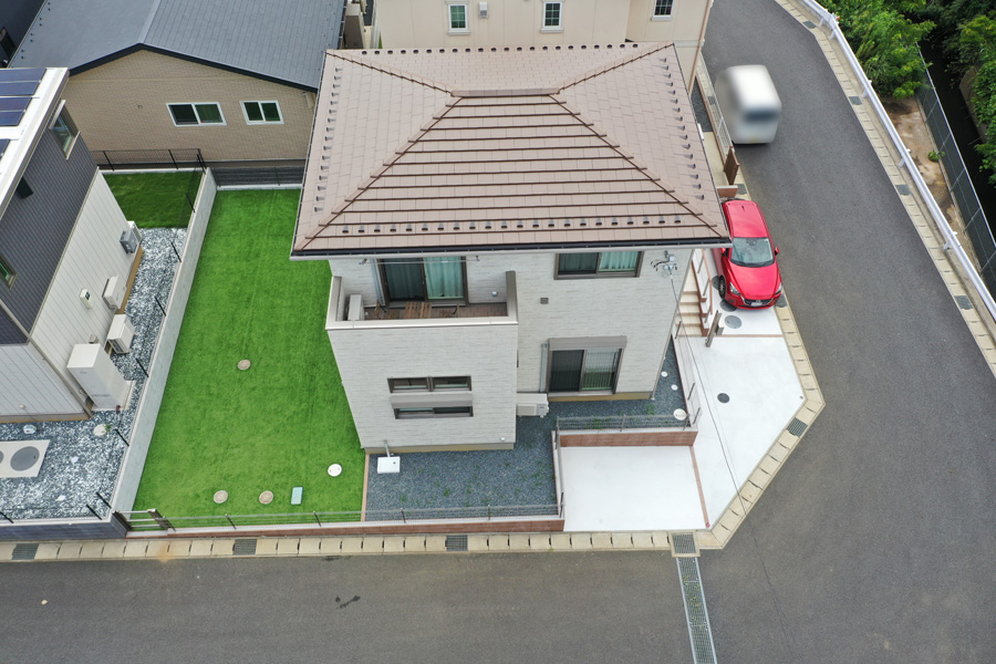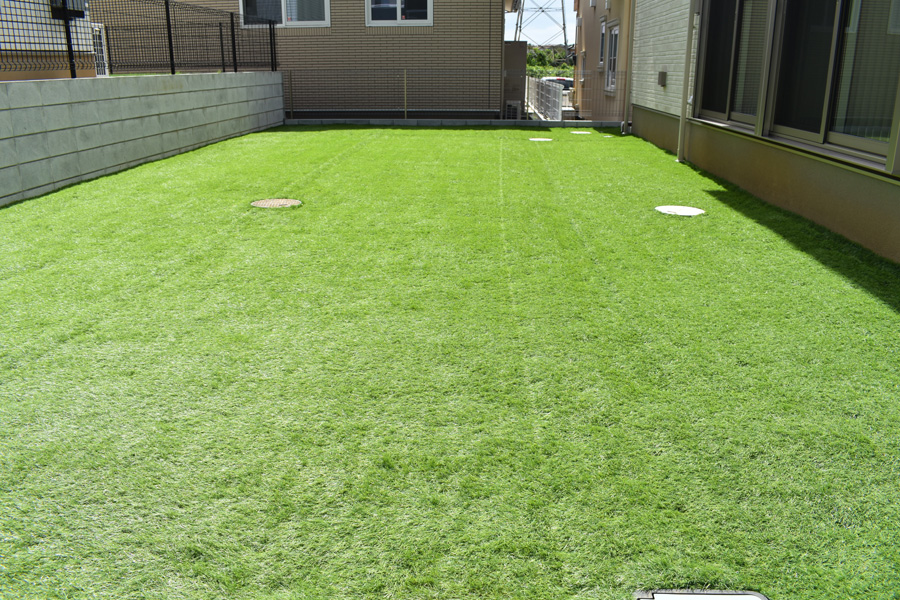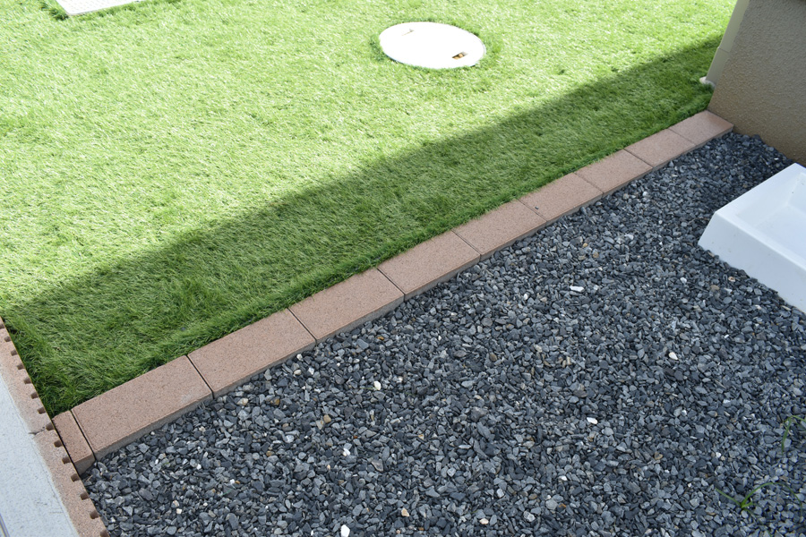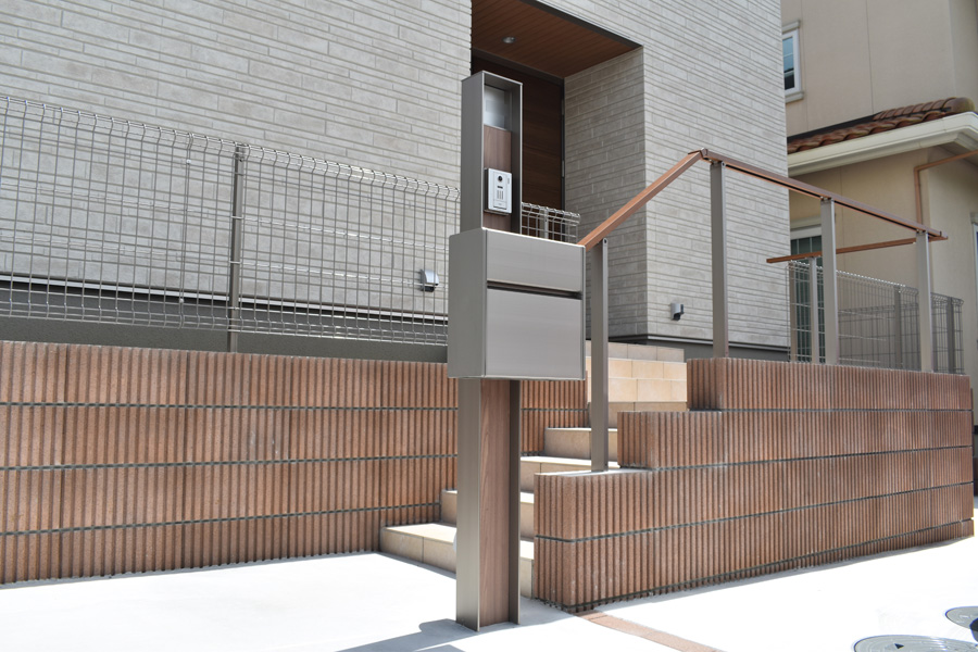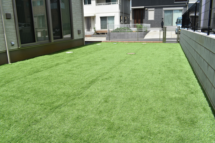 機能門柱や玄関へのアプローチなどをスタイリッシュに仕上げ、色合いも住宅と同一にすることで一体感のある外構に仕上げました。広いお庭には人工芝を施工し、お手入れも簡単な理想のお庭にすることが出来ました。