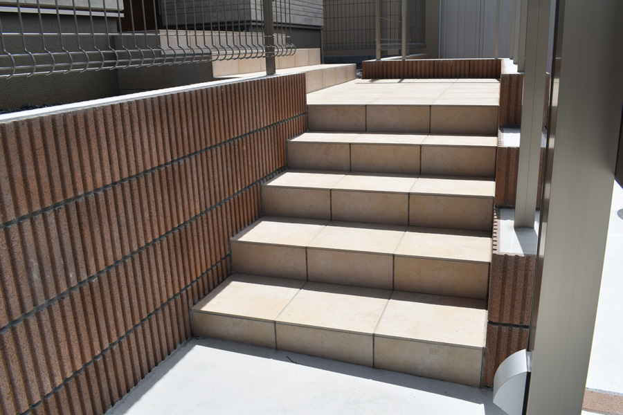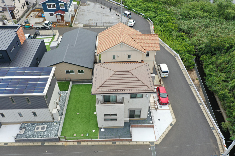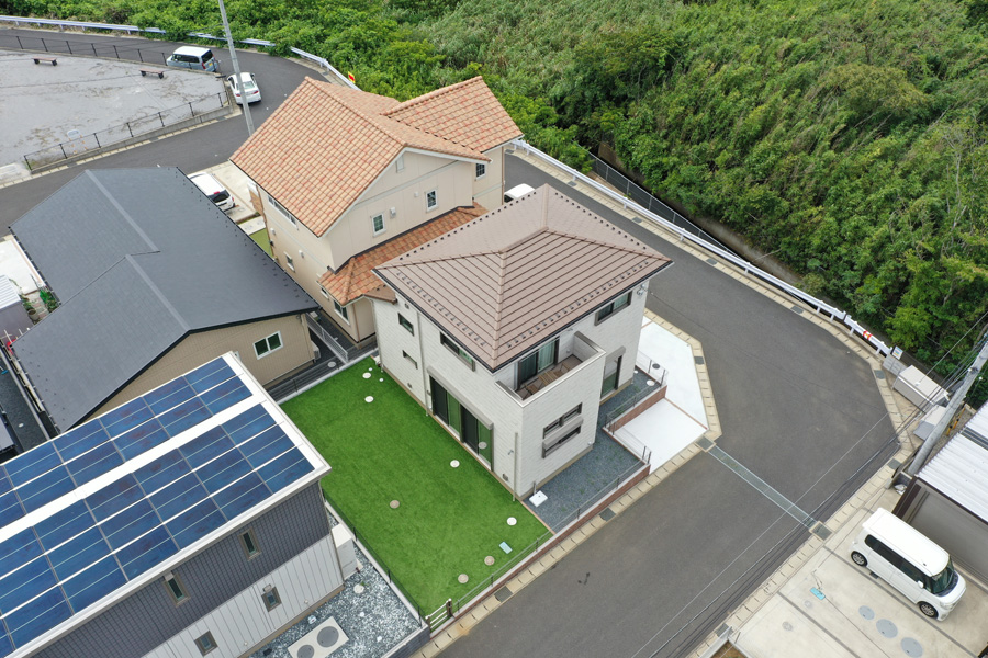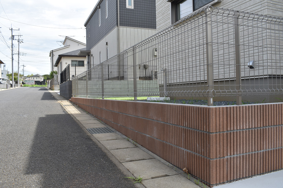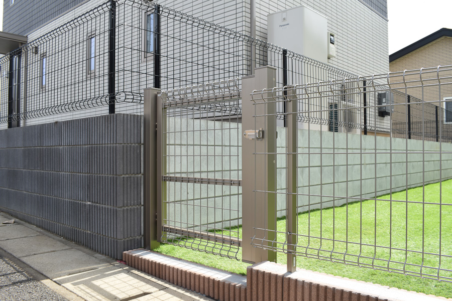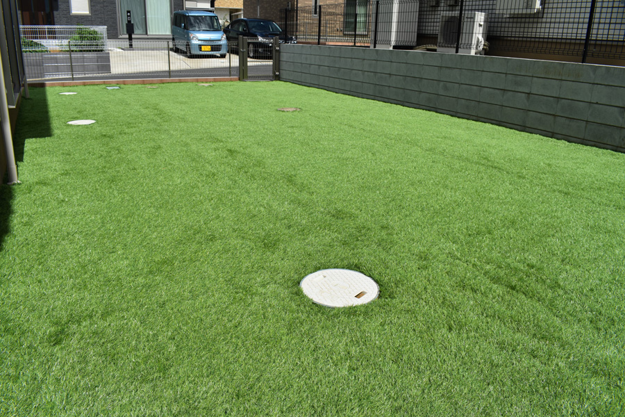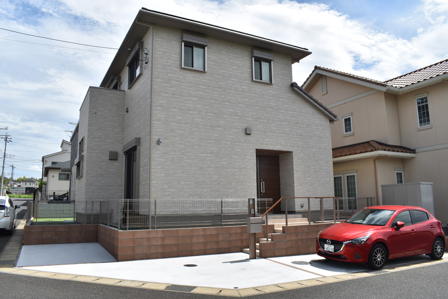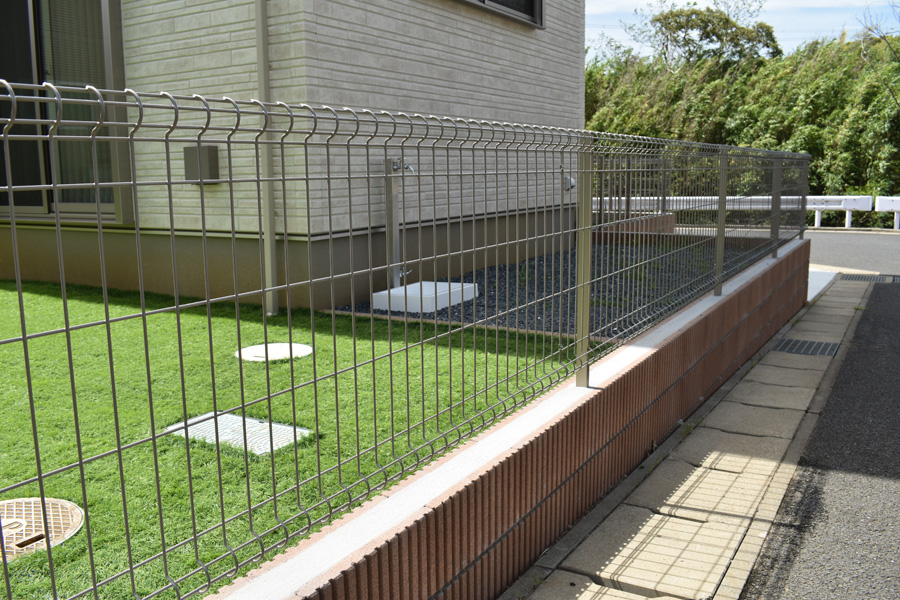 機能門柱や玄関へのアプローチなどをスタイリッシュに仕上げ、色合いも住宅と同一にすることで一体感のある外構に仕上げました。広いお庭には人工芝を施工し、お手入れも簡単な理想のお庭にすることが出来ました。