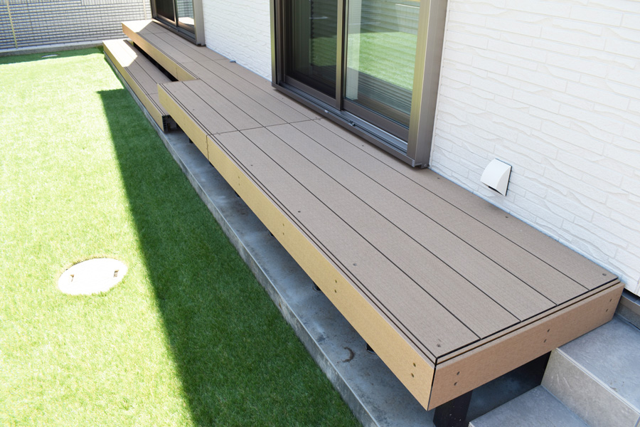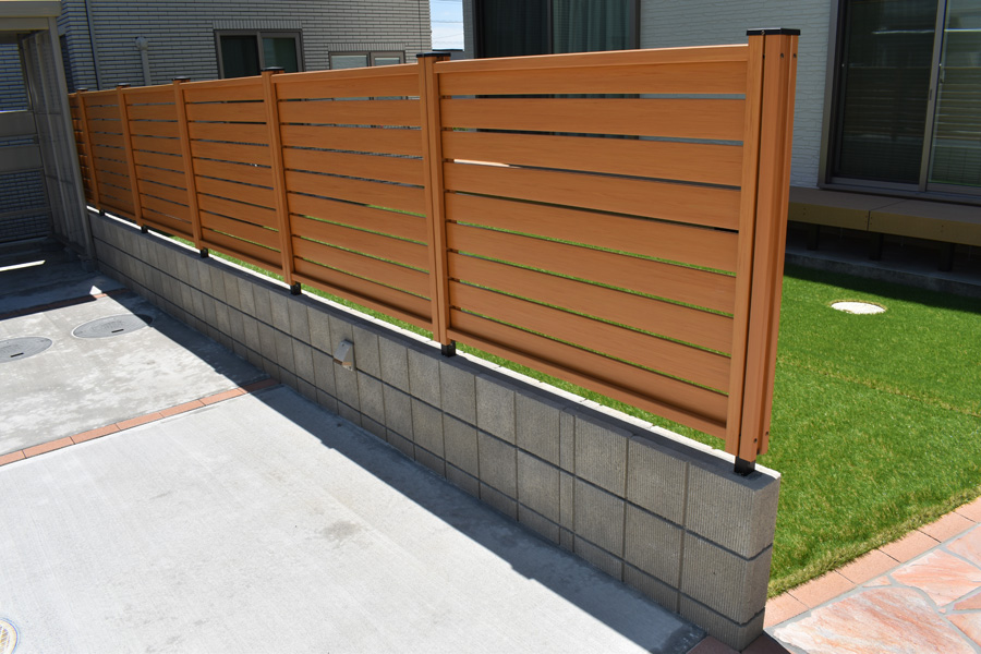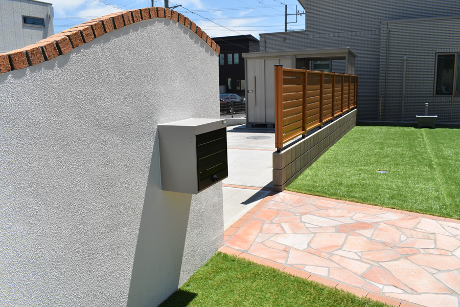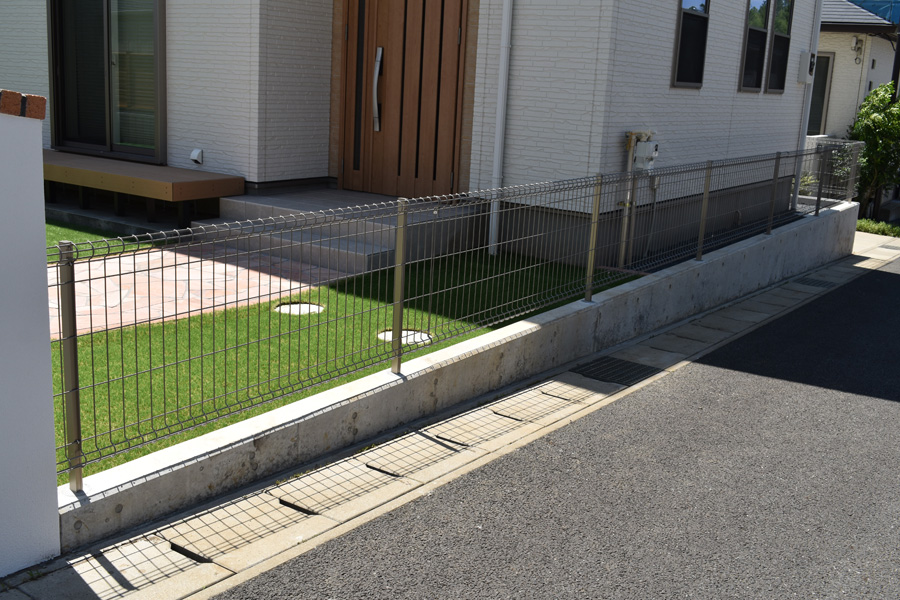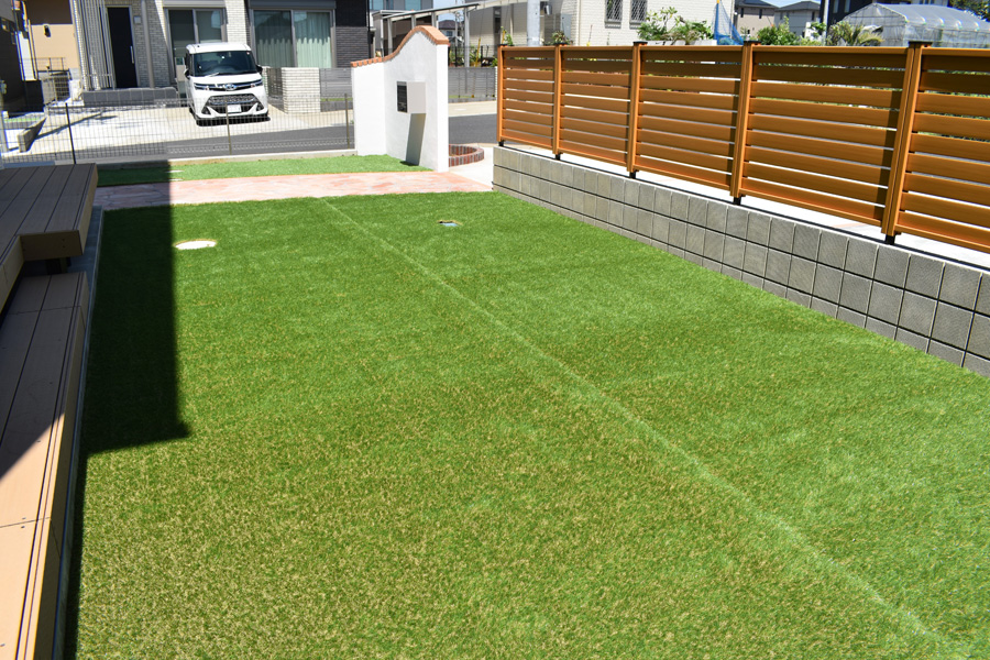 そんなお客様のご要望に応えられるように外構を考えさせていただきました。お庭には人工芝を施工しお子様が転んでもケガが起きにくいようにしました。また、そこに目隠しフェンスを設置してプライベートな空間を作り、子供たちが集中して遊べるように施工させて頂きました。