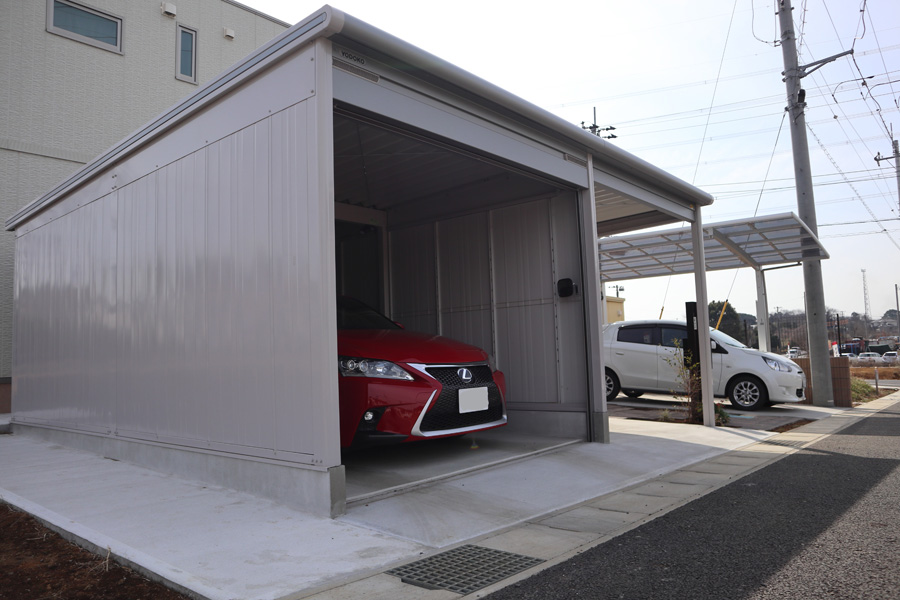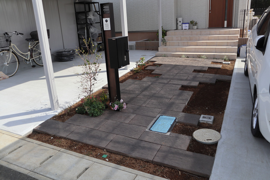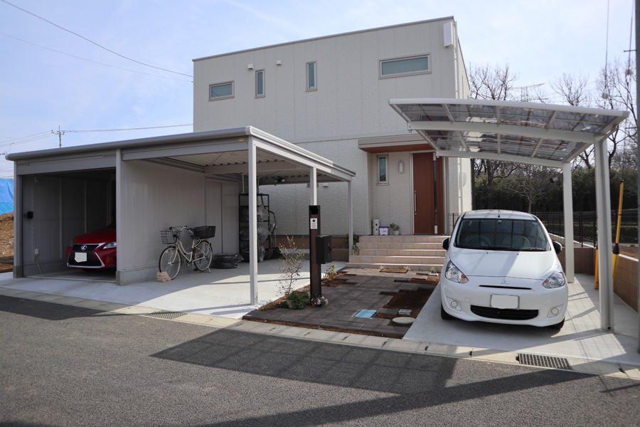 お客様は車が大好きな方で、大切な車をしまうガレージが欲しいとのことでした。今回は、そんなお客様のご要望にお応えして、ガレージとカーポートを設置させて頂きました。機能門柱の下にはお花が植えられるようになっています。
