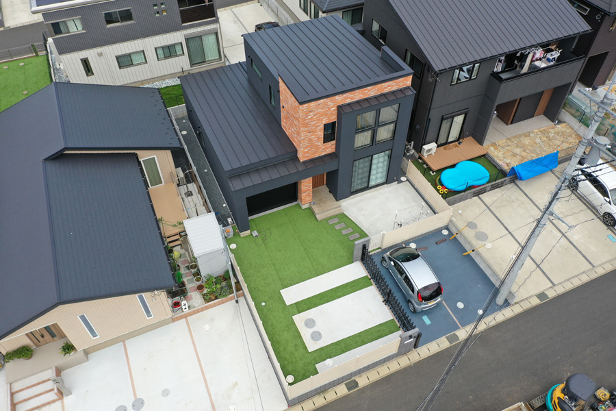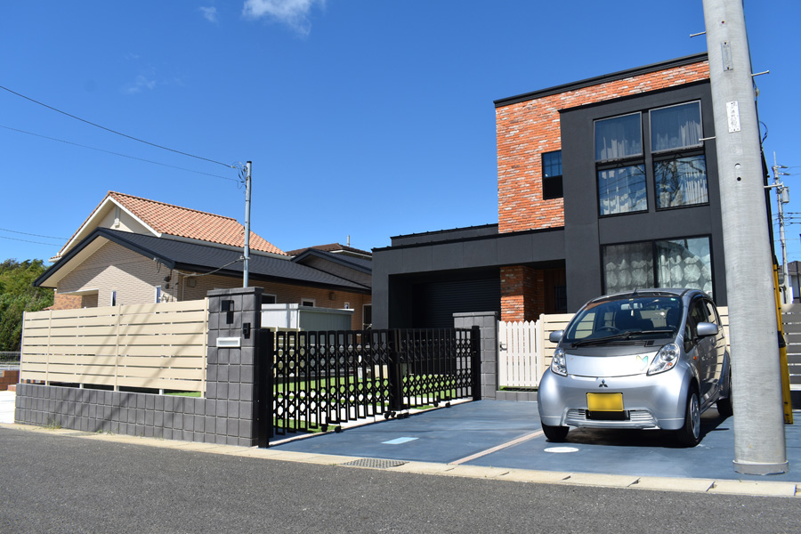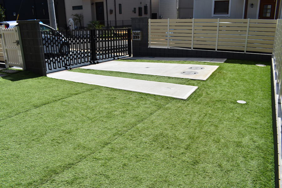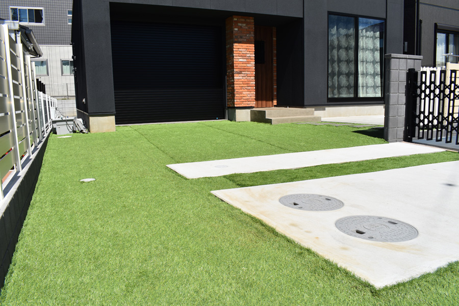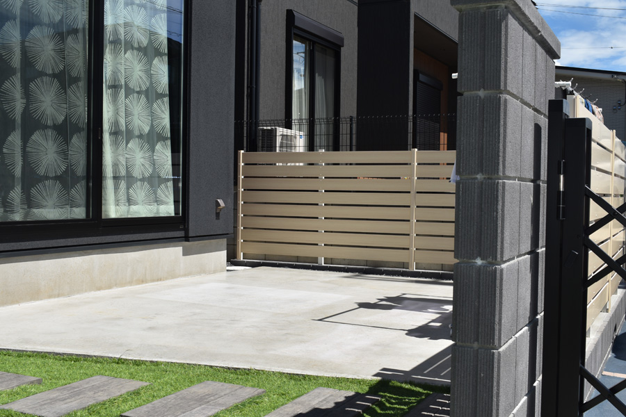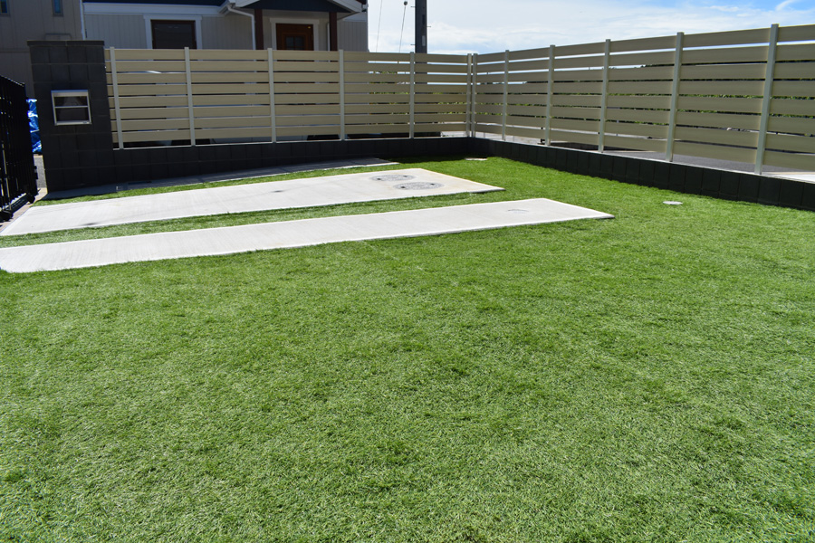 住宅に合わせた外構にしたいとご相談下さったお客様。駐車場のコンクリートの色もこだわって選ばれておりました。また、フェンス扉から玄関へと入る道や、お庭に人工芝を敷くなど、こだわって施工させて頂きました。