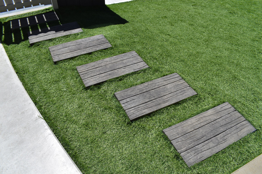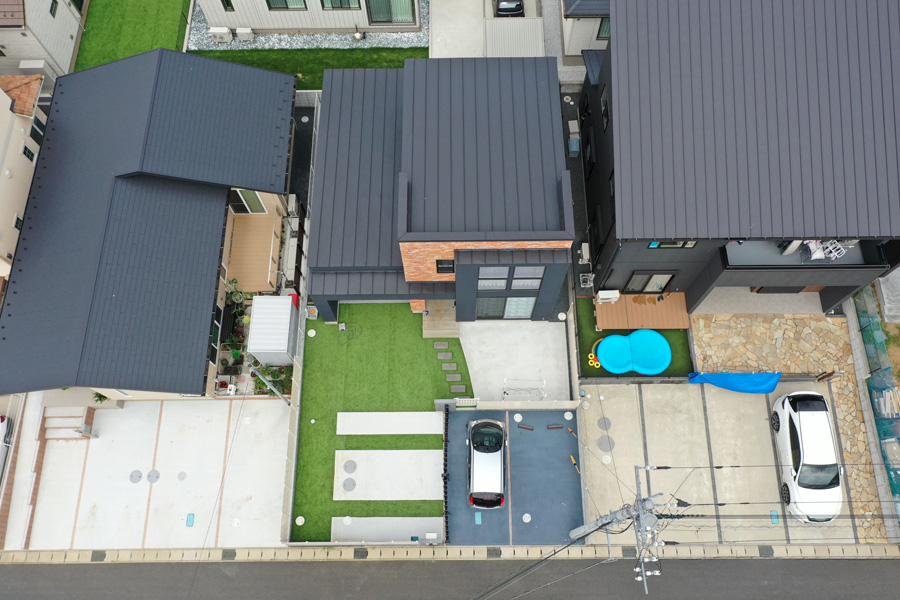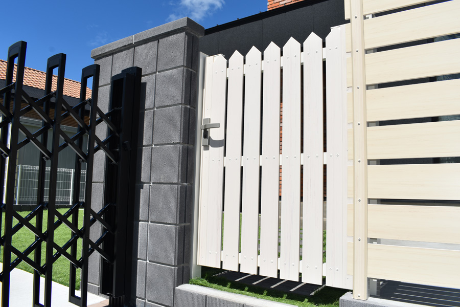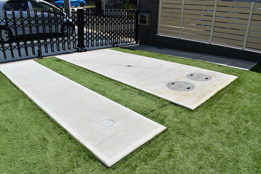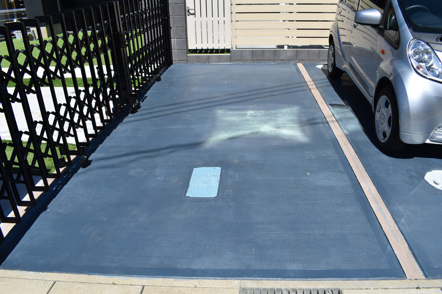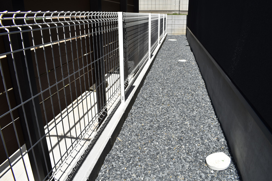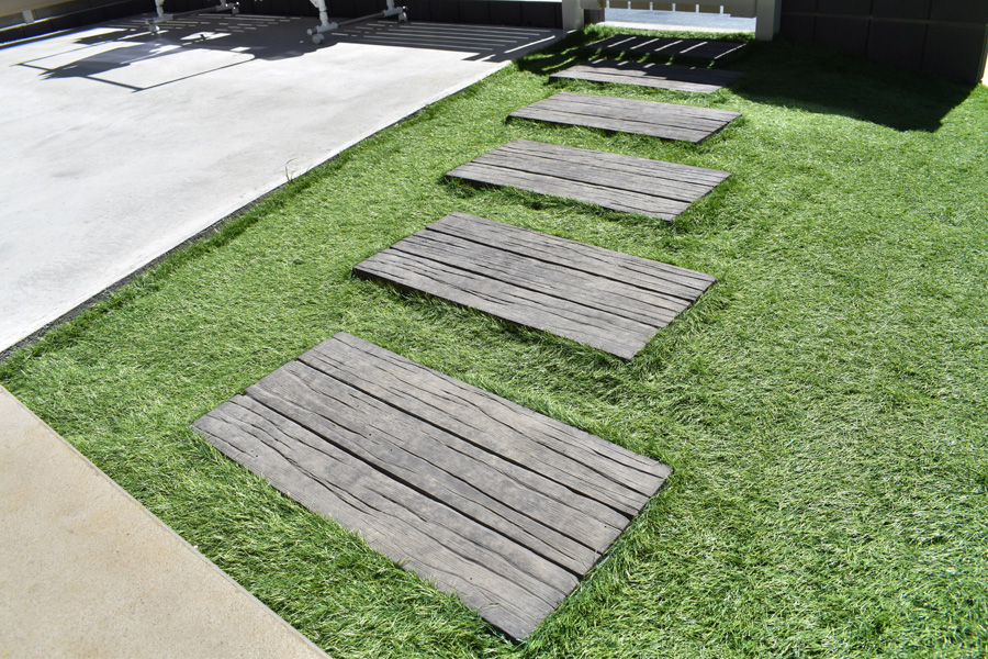 住宅に合わせた外構にしたいとご相談下さったお客様。駐車場のコンクリートの色もこだわって選ばれておりました。また、フェンス扉から玄関へと入る道や、お庭に人工芝を敷くなど、こだわって施工させて頂きました。