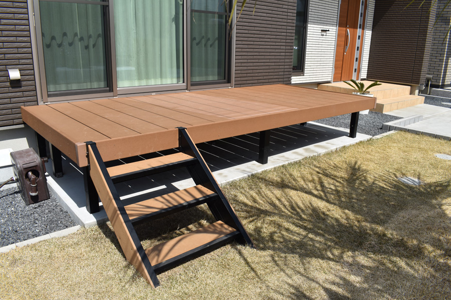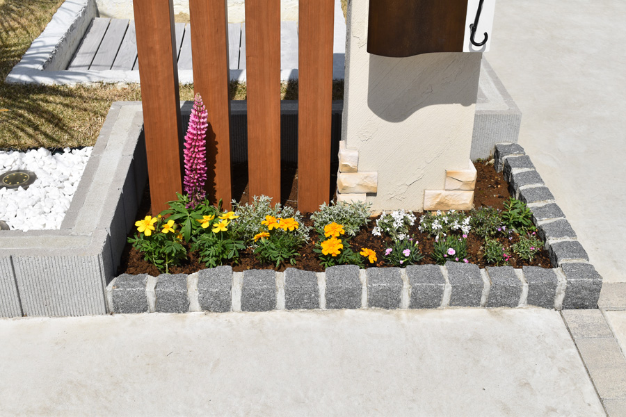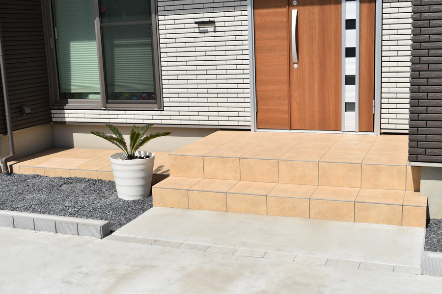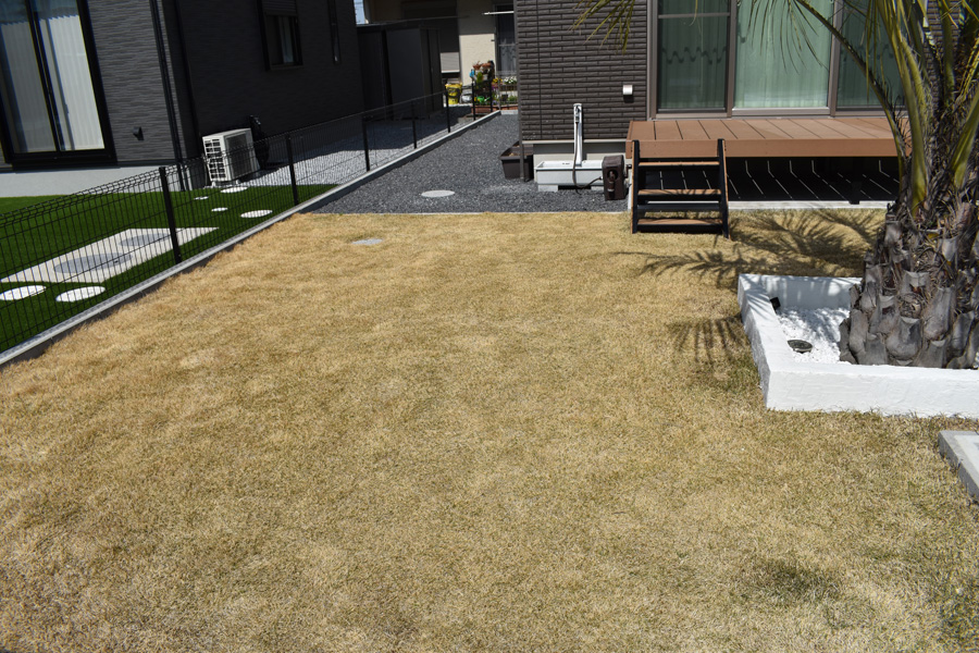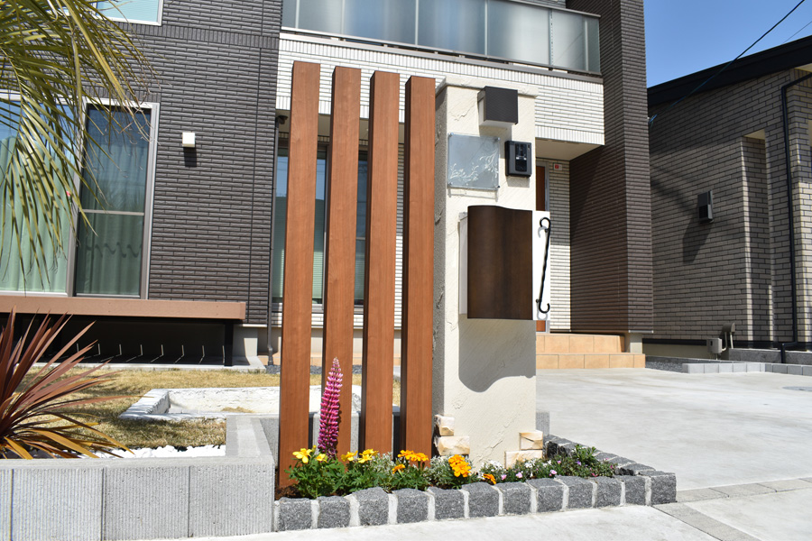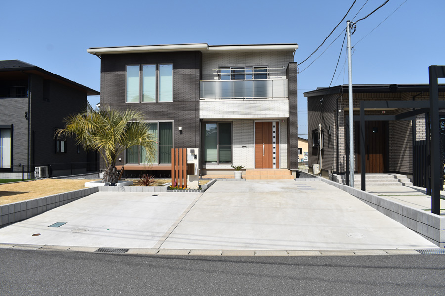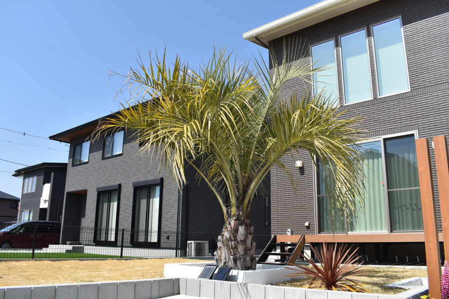 今回の外構は南国をイメージしたシンプルな外構がいいとのお客様からのご要望でした。植樹はヤシの木を一本行っただけで一気に南国なイメージに近づきましたね♪また、外構の差し色として明るい茶色を使用したことで、明るいイメージに仕上げることが出来ました。